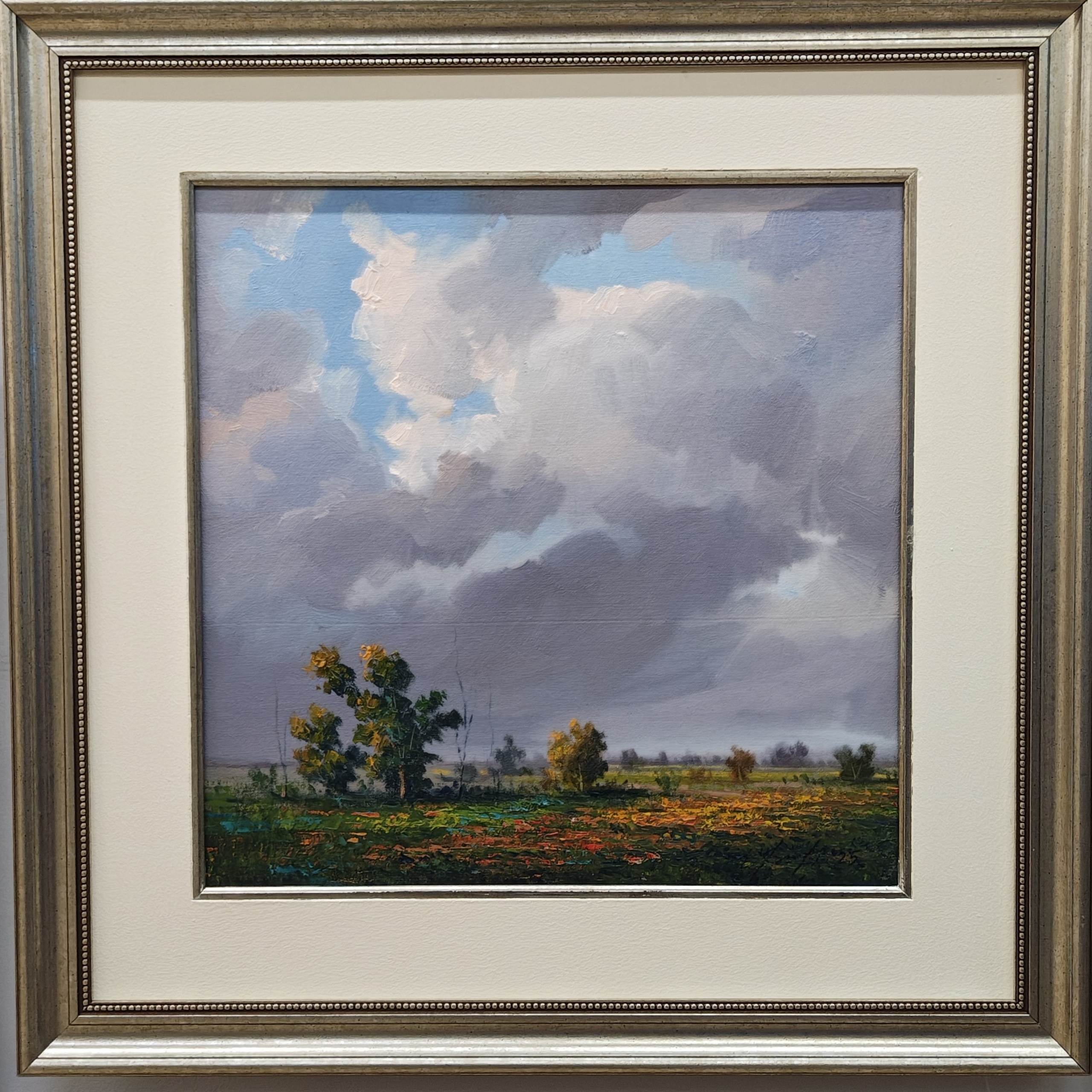 Description: A study of contrast, this painting features a low horizon line that gives way to a monumental sky filled with soft, voluminous clouds. The foreground is alive with flecks of orange and yellow, suggesting a field of wildflowers caught in the cool, diffused light of an overcast day just before the rain begins to fall.